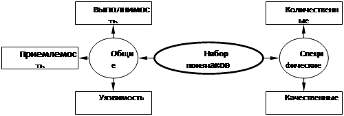 Как правило, всегда имеется несколько признаков решения. Существует сравнительно немного реальных решений, которые могут быть оценены при помощи единственного признака. Не существует "универсального" списка признаков оценки. Можно говорить о системе признаков, включающих две подсистемы общих и специфических признаков (рис. 3).