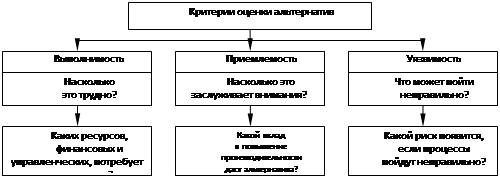 Общими признаками при оценке альтернативы являются ее выполнимость, приемлемость и уязвимость.