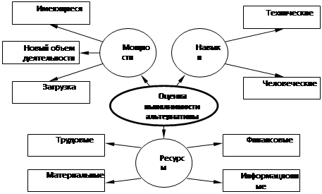 Оценка выполнимости альтернативы означает выяснение соответствия объема и ассортимента требуемых ресурсов доступным ресурсам или тем, которые могут быть получены.