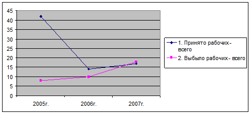 Сравнивая периоды 2007-2008гг. выяснилось, что среднесписочная численность работников увеличилась на 4 человека, несмотря на то, что в 2008г. принято на 28 человек меньше, чем в предыдущем, а уволено на 2 человека больше. По собственному желанию уволилось в полтора раза больше рабочих, а за прогулы уволено вдвое меньше. Темп роста числа выбывших работников выше темпа роста числа прибывших на 1%. Коэффициент оборота по приему рабочих снизился на 0,87, а коэффициент оборота по выбытию вырос на 0,03. В 2009г. число уволенных работников заметно увеличилось по сравнению с предыдущими периодами. Увеличились коэффициенты и по приему и по прибытию работников. А коэффициент текучести кадров увеличился по сравнению с 2008г. в 1,8 раза. Такая текучесть кадров влечет за собой снижение производительности труда.