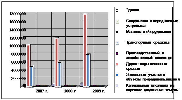 Наибольшую долю в структуре основных фондов занимают сооружения и передаточные устройства, в 2007 г. – 64,56%, в 2008 г. – 64,35%, в 2009 г. – 67,23%. Такой большой процент связан с тем, что ООО «Лукойл – Западная Сибирь» осуществляет добычу нефти и газа, а также обустройство месторождений. Сюда относятся трубопроводы, электросети, теплосети.