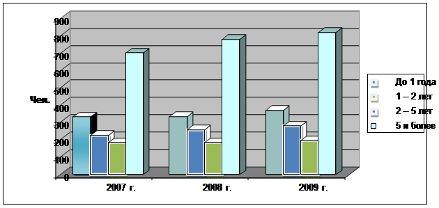 На протяжении 2-5 лет работают в 2007 г. – 184 человека (12,7%), в 2008 г. – 184 человека (11,8%), в 2009 г. – 196 человек (11,8%).