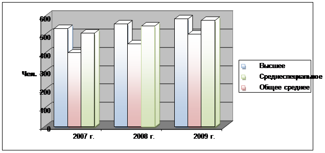 В базисном году среднеспециальное образование имело 403 человека(27,8%), в 2008 г. 451 человек (28,9%), в 2009 г 504 человека (30%). За 3 года происходила тенденция к росту.