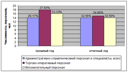 Численность торгово-оперативного персонала, который целиком состоит из продавцов, в отчетном году уменьшилась почти на 17% (3 человека). В структуре основных категорий численность торгово-оперативного персонала в отчетном году по сравнению с прошлым уменьшилась на 2,62% и составила около 35%.