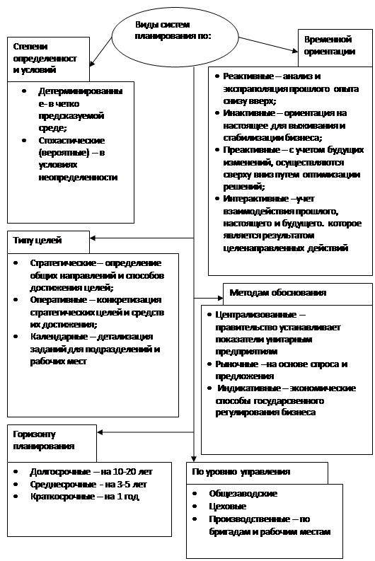 Все процессы и этапы планирования на предприятии взаимосвязанны и зависят друг от друга. В совокупности они составляют определенную систему планирования, которые можно классифицировать по степени определенности условий, временной ориентации разработчиков плана, типу целей, методам обоснования и другим признакам (рисунок 2).