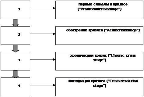 Многие авторы делали попытки сформировать наиболее правильную модель развития кризиса. Более полной, на мой взгляд, является модель жизненного цикла кризиса, описанная американским ученым Стивеном Финком в его труде "CrisisManagement". Автор выделял следующие четыре стадии (рис.5):
