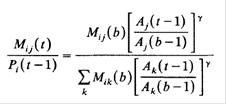 где k включает весь набор регионов, Мij относится к людям, которые остаются в регионе i ("стайеры"), A относится к индексу привлекательности региона, и y - параметр, измеряющий величину миграции в ответ на изменяющуюся привлекательность региона.
