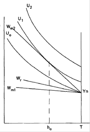 Yn - доход неработающего потребителя и набор кривых Ui изображают предпочтения потребителя между досугом и доходом. Для решения участия в рабочей силе (Рисунок 1), критический параметр - абсолютная величина наклона линии wr, касательной к кривой безразличия в точке, где часы работы равны нулю и доходом, не связанным с работой - Yn. Этот наклон - минимальная заработная плата потребителя (или теневая заработная плата в нулевые часы работы), зависящая как от Yn, так и от предпочтений потребителя между доходом и временем, доступным для отдыха. Набор потребительских выборов между доходом и досугом, показывается линией, идущей из точки (T, Yn) с абсолютным наклоном wm, где wm является рыночной заработной платой. Для wm <wr (то есть Wm1 на рисунке 1), потребитель максимизирует полезность в угловом решении (T, Yn), то есть не участвуя в рабочей силе. Для wm> wr (Wm2 на рисунке 1), участие происходит с уровнем затрачиваемых на работу часов, отличным от нуля (T-h0 для wm2 на рисунке 1).