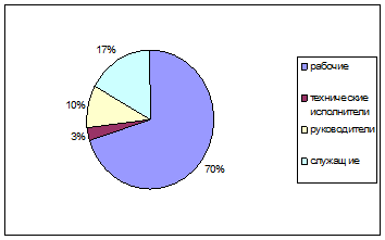 70% сотрудников - рабочие или заняты на производстве, 30% - НТР, из них: 10% руководители и 17% - служащие,3% - технические исполнители.