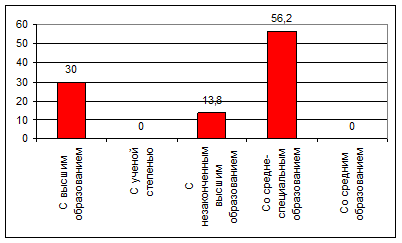 Что же касается состава персонала по образованию, то мы видим, что 56,2 сотрудников имеют средне-специальное образование, 30% - высшее, 13,8 - незаконченное высшее образование.