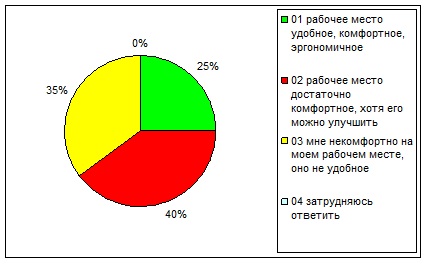 35% опрошенных полагают, что их рабочее место сделано нерационально, 30% также склоняются к отрицательному ответу, 20% отметили, что их рабочее скорее комфортно, чем нет, и лишь 15% опрошенных ответили, что рабочее место удобное и комфортное.