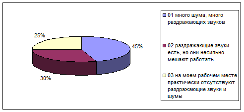 45% опрошенных недовольны уровнем шума на их рабочем месте, 30% отметили, что раздражающие звуки есть, но они несильно мешают работать, 25% считают, что на их рабочем месте лишние шумы и звуки отсутствуют.