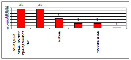 33% -там не хватает канцлерских принадлежностей, 33% улучшили бы оргтехнику, 17% - мебель, лишь 8% в первую очередь улучшили бы освещение и уровень шума на их рабочих местах.