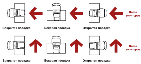 Чем дальше от входа в отдел, тем выше субъективная оценка статуса сотрудника. Закрытая посадка подразумевает субъективно большую дистанцию при общении с визитером, боковая посадка - равное положение, открытая посадка - подконтрольное положение сотрудника.