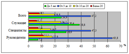 На рисунке 2.5 видно, что основную долю коллектива банка «БНП ПАРИБА» ЗАО составляет работники, проработавшие до 3 лет и от 3 до 10 – 72,1%, в том числе 19,8% – от 10 до 20 лет и 8,2% – более 20 лет.