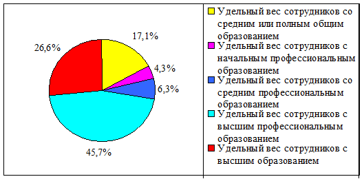 Высок в целом образовательный уровень коллектива, 78,6% – работники имеют высшее профессиональное, среднее профессиональное и высшее образование, в том числе 45,7% – высшее профессиональное образование, 26,6% – высшее образование и 6,3% – среднее профессиональное образование, как показано на рисунке 2.6.