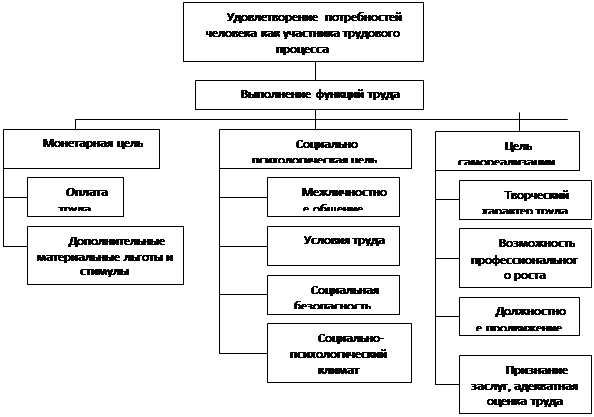 Итак, с точки зрения работника, его потребности могут быть выражены через функции труда, которые он (т.е. труд) выполняет по отношению к человеку как участнику конкретного трудового процесса. Эту систему целей структурно можно представить следующим образом (рис.2).
