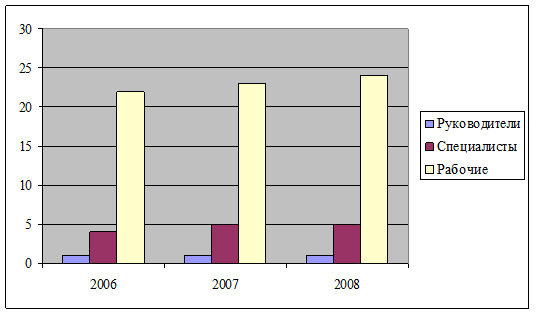 В целом по такому небольшому предприятию наблюдается положительная динамика кадров. Так, на протяжении 2006-2008 гг. общее количество работников увеличилось на 3-х человек (рис. 1).