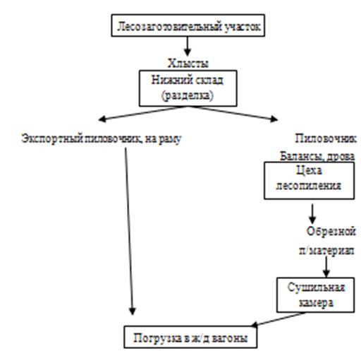 Из схемы видно, что на первом этапе производства лес попадает с лесозаготовительного участка на нижний склад, где происходит разгрузка, раскряжевка, сортировка, штабелевка и т. п. На данном предприятии прирельсовый нижний склад, пиловочник погружается в железнодорожные вагоны, а не сплавляется по реке. На нижнем складе определяют экспортный пиловочник, сразу происходит погрузка в железнодорожные вагоны, кругооборот нижнего склада составляет 160 т. м.3. На следующем этапе остальной пиловочник при сортировки идет в цеха лесопиления, где из круглого леса получают заготовки бруса, доски, горбыль. Погрузка в железнодорожные вагоны осуществляется только после сушильной камеры.