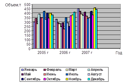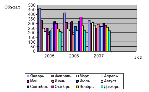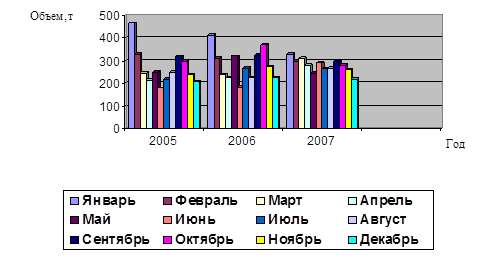 Далее рассмотрим потребность каждой закупочной позиции в месяц в динамике за 2005-2007гг (в тоннах).