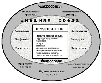Внутренние факторы в основном являются результатом управленческих решений, в то время как внешние факторы являются факторами среды, находящиеся вне предприятия, которые оказывают серьезное влияние на его успех. К ним следует отнести крупных конкурентов, источники получения техники и технологии, социальные факторы, государственное регулирование и другие изменения. Хотя внешние факторы находятся вне контроля руководства, но в тоже время руководство ООО «А-маркет» стремится сделать так, чтобы их предприятие реагировало на изменения в конкретной внешней среде, так как предприятие намеревается достичь поставленных целей. На рис. 2 представлена структура и место внешнего и внутреннего окружения предприятия.