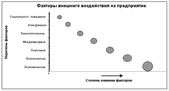 На рис. 3 приведены результаты предварительной оценки степени влияния основных факторов внешнего воздействия на предприятие, полученные путем качественного анализа особенностей функционирования предприятия в условиях стабильной внешней и внутренней среды. Необходимо отметить, что степень влияния факторов внешнего воздействия на предприятие в значительной мере определяется типом внешнего окружения, видом реализуемой продукции, принятыми управленческими решениями.