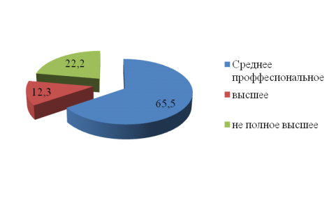 По данным, представленным на рисунке 2, можно констатировать, что наибольшее число работников имеют не полное высшее образование, они в данной структуре занимают долю в 65,5%. 22,2% имеют среднее профессиональное образование. Высшее образование имеет лишь 12,3% работников Администрации Барун-Хемчикского кожууна.