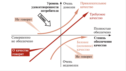 Если считать, что новая характеристика должна повышать удовлетворение потребителя, то можно разделить все характеристики товара/услуги (аналогично потребностям) на три типа: обязательные, одномерные и привлекательные.